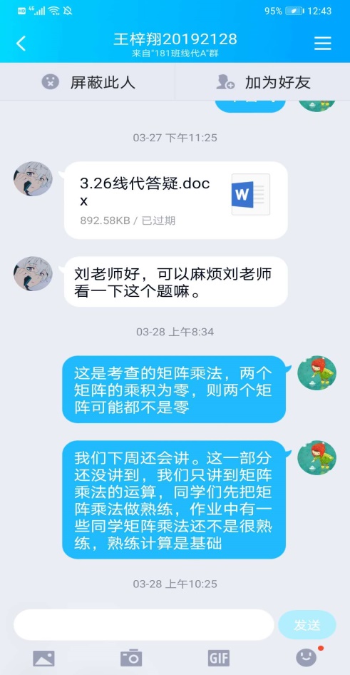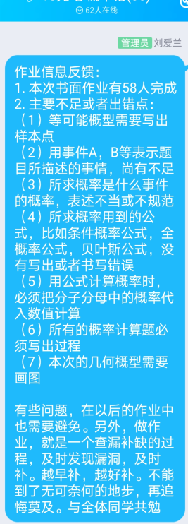 针对学生反映的课堂听讲PPT不容易接受,她采用PPT+手写板板书讲解,效果很好。课堂QQ群提问,课堂练习,不时抽查学生的听课笔记,学生分组学习辅导,课后作业逐人次批改并针对性给出评语,QQ群做出总体作业分析。智慧树课堂答疑、群聊、头脑风暴,QQ群留言、私聊等进行课堂课后多方位与学生沟通和交流。