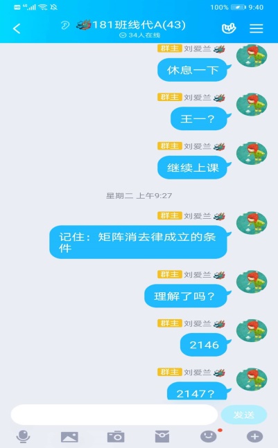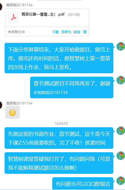 经过尝试,她采取了智慧树+QQ群的方式。由于需要在两个平台间切换,上课流程方面不断丰富。课前QQ群发布上课流程公告,发布头脑风暴复习上一节课的知识点。课中采用智慧树平台见面课发布上课流程的PPT,每一个节点每一个知识点都在QQ群聊书面提醒,课中智慧树线上作业巩固(这一模块经常放到线下完成),见面课+QQ群课堂随时答疑。课后QQ群布置书面作业。