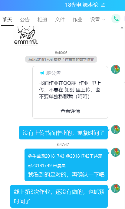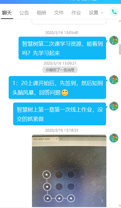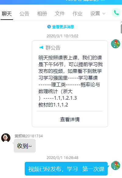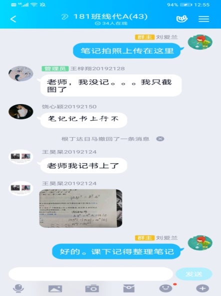 线上上课不同于线下,同学居家不在校,没有一起起床吃早饭去上课的氛围。她就在上课前一天利用QQ群提醒同学上课的时间段,课前需要完成的学习内容。在上课前15分钟提醒准备上课,试音和屏幕。上课过程中,不时提醒学生注意,对所学知识点做好笔记,对所学知识进行及时消化,有不懂的地方及时提出。课后提醒学生完成线上作业和书面作业,及时复习巩固所学知识。对学习不主动的、学习成效不高的学生,共享课中进行督促完成相关视频和知识的学习。课前课后的提醒几乎无时不在,甚至在周末也有。在她各种提醒下,学生上课迟到旷课现象基本杜绝。