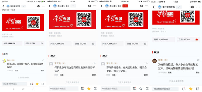 支部党员通过学习强国平台,积极自学了《习近平总书记考察浙江纪实》相关报道内容并进行留言,深入了解全国各行业、产业以宁波舟山港为代表,逐渐复工复产,并逐步恢复至日常水平,全国经济发展稳中向好。