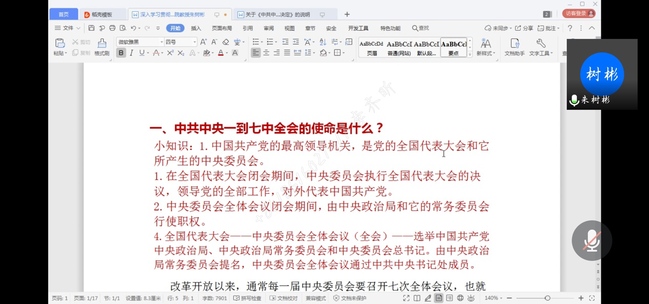 党课上,朱树彬教授首先给学员们介绍了每一届中共中央委员会召开会议的频次,详细解读了每次会议讨论的主要内容。随后,他详细介绍了十九届四中全会的主要内容和精神。第一,坚持和完善中国特色社会主义制度推进国家治理体系和治理能力现代化的重大意义。第二,全会强调了我国国家制度和国家治理的显著优势等等。最后,朱教授将治国理政和近期抗疫战斗联系起来。他说:“本次疫情防控彰显了我国制度的巨大优势,面对突如其来的新冠肺炎疫情,是对国家治理体系和治理能力现代化的一次大考。我国在以习近平总书记为核心的党中央的领导下疫情防控和经济社会发展“双统筹”稳步走向“双胜利”,彰显了中国之治的生动实践和显著优势。”