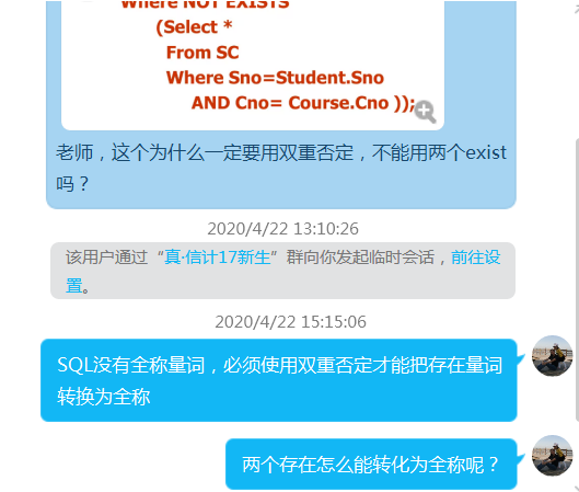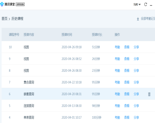 为了让学生能够保质保量的完成学习任务,冯莉老师根据不同课程的实际情况,选择不同的教学平台。比如数据库原理课程,由于MOOC视频内容相对较少,冯莉老师采用腾讯课堂直播讲解的方式开展理论教学,利用腾讯课堂的回放功能,可以保证同学们在课上听不懂的地方能够及时回看。需要上机实验的时候,则采用腾讯会议的方式开展,利用腾讯会议每一位参与者均可以分享屏幕的功能,能够更好在同学们出现问题时答疑解惑。同时结合课程QQ群,同学们可以分享问题截屏,老师在线解答,实时沟通。