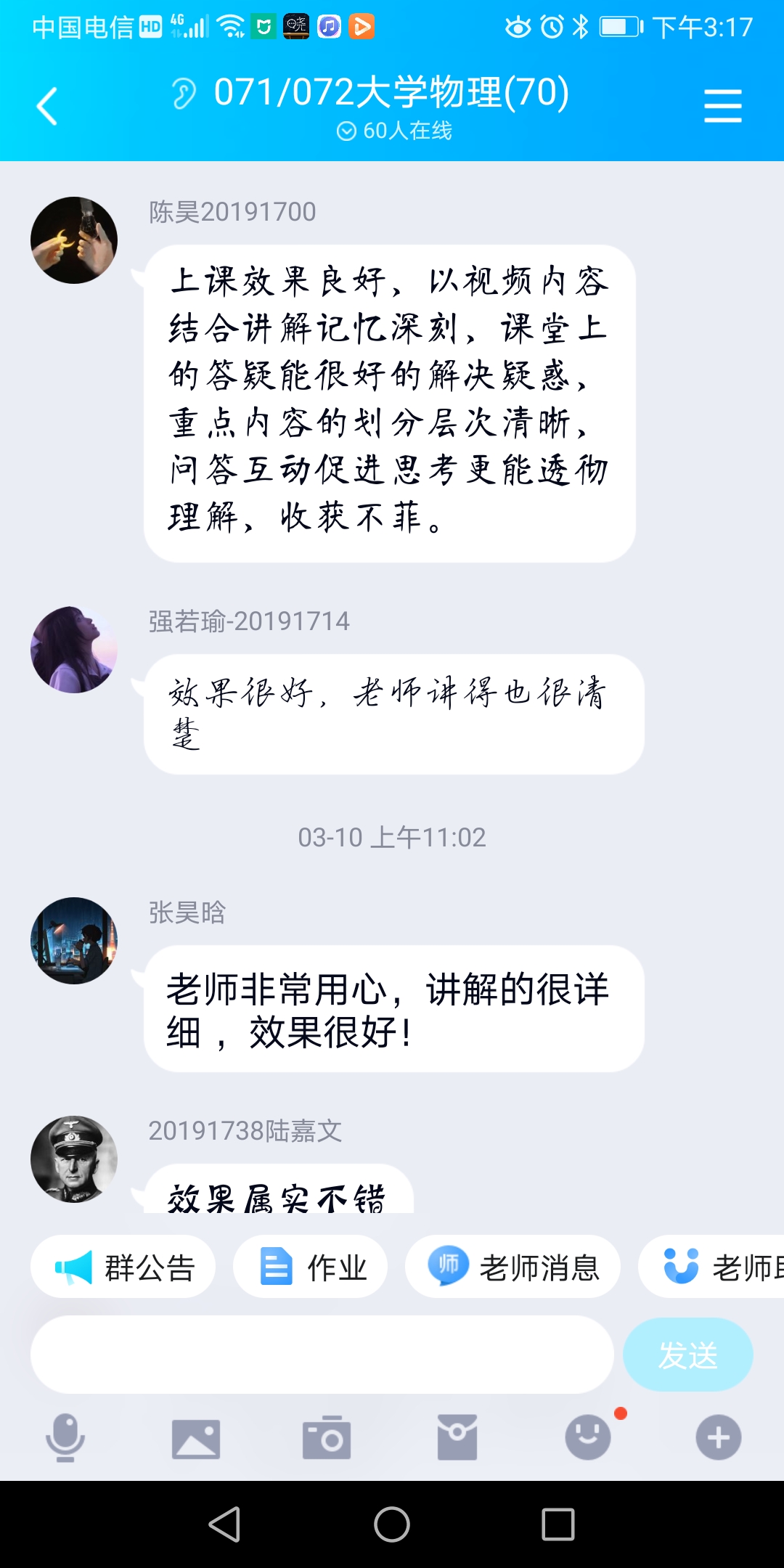 网络教学平台有各种网络资源,丰富多彩,开拓了学生的眼界。但是和教学方案规划的课程内容比较还是有一些出入,如何才能让学生最大限度的学好课程内容成为曹海静老师深思的一个问题。智慧树见面课语音交流的弊端,网络信号不好,直播中断,学生听课“溜走”等等现象,最终曹海静老师采用了录课的形式进行教学。在家中把所负责的两门课程《热力学与统计物理》和《大学物理》全部以小节为单位进行录制。给学生上课的时候,利用智慧树让学生签到,之后进入腾讯会议上课。播放的过程中随时暂停提问,保证学生的听课效率。最后进入智慧树见面课平台进行互动,加深本节内容的理解。课程QQ群则用于平时的反馈和答疑。