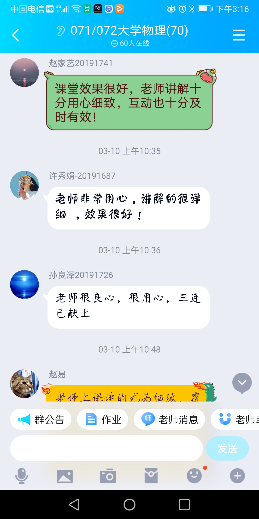 曹海静老师,自带与生俱来的亲和力和强大的气场,是一个天生的“老师”。“亲其师,方能信其道。”曹老师天生的亲和力,让她的课堂自带“磁场”。网络授课,她也像平时线下上课那样,经常“漫步”于学生中间,像大姐姐一样和他们聊天,给他们鼓励:“同学们真棒,今天每个同学都准时进来听课”,“表扬积极思考,积极发言的同学”。她充分利用课程教学的各个关键时间截点对同学们进行思想教育:“请认真听课,我要随时提问!”,“这次期中考试,请同学们严肃考风考纪,诚信考试”。曹老师的谆谆教诲和殷切嘱托总是回响在同学们的耳畔。