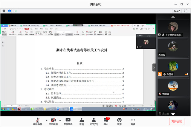 会上,学院教务老师于文英围绕本学期期末线上考试,从考前准备、考试过程和考试结束三个方面进行介绍。在考前准备中,任课老师和监考老师相互协调配合,根据考生人数做好考场分配,提前预约好腾讯会议室,在考试平台提前做好考生信息维护和试卷上传等工作。同时,任课老师需提前提醒考生考试注意事项,并对考生做诚信考试教育。对考试过程中学生身份核验、试卷的提交、试卷提交异常情况的处理以及考试结束后试卷检查、非现场考试记录表登记等做了详细说明,并对监考教师就在线考试的有关问题进行了一一解答。