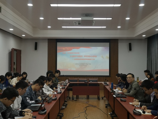 为进一步深入学习习近平新时代中国特色社会主义思想,深入推进“四史”学习教育,进一步巩固不忘初心、牢记使命主题教育成果,加强领导干部联系基层党支部的制度,使“四史”学习教育真正学在深处、落在实处,10月26日下午,副校长符杨以“认真学习国史 牢记初心使命 ——全面推进我校学科建设工作”为题,在临港校区学术楼305会议室作“四史”学习教育专题党课。437bwin必赢国际官网党委及党政班子成员、机关党委科研处党支部党员及符杨副校长联系的437bwin必赢国际官网研究生党支部全体党员到会聆听了党课。