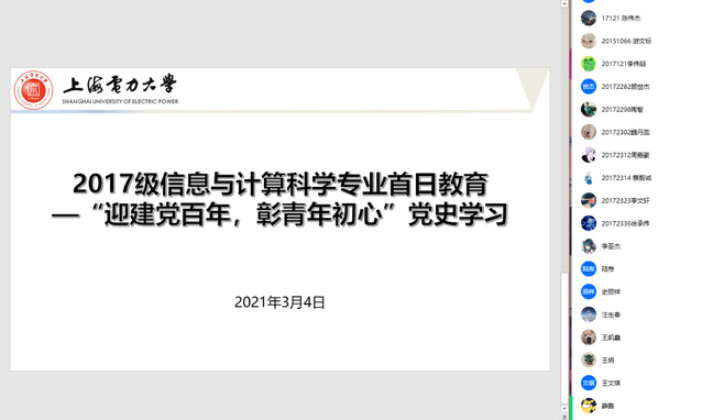 2017级在开学第一周以线上形式开展首日教育,围绕党史学习教育,考研、就业辅导,疫情防控等主题展开,号召毕业班学生树立正确的择业观,以青春之行回报祖国,以奋斗之我献礼百年华诞。