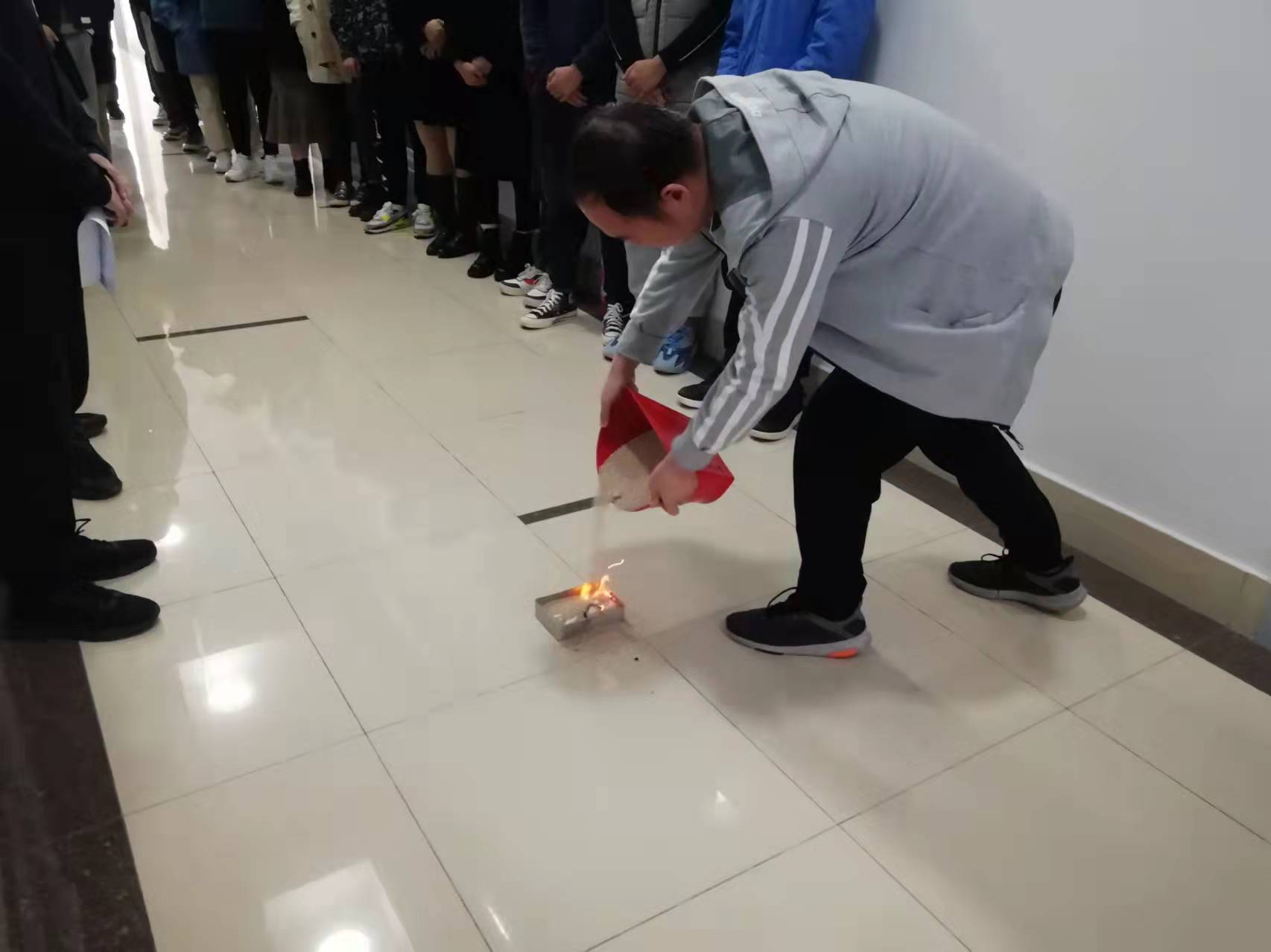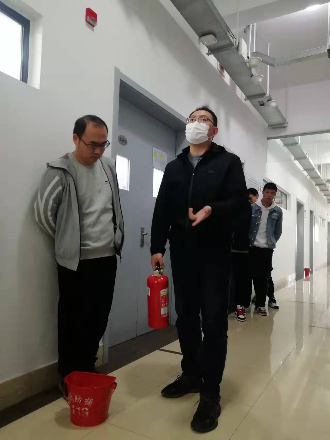 演练场景2:数理楼B503实验室,学生在做加热实验时,由于温度过高,造成局部发生了小面积着火,学生开展自救行动,立即用一楼楼道中的沙桶将火扑灭。同时,同组学生第一时间也联系到自己的导师,导师立即赶到现场进行处理。