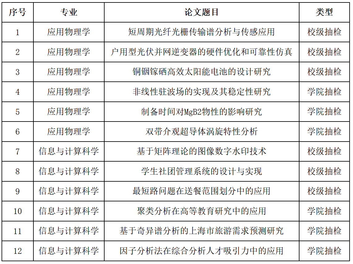 为提升毕业设计(论文)工作质量,落实闭环管理。根据学校相关工作部署和437bwin必赢国际官网2022届毕业论文抽检工作安排及实施方案的要求,采用“校级抽检+院级抽检”相结合的方式,从学院2022届121篇论文中按照10%比例随机抽取12篇,主要对毕业论文选题意义、写作安排、逻辑构建、专业能力、 学术规范等要素进行抽检评议,具体名单如下: