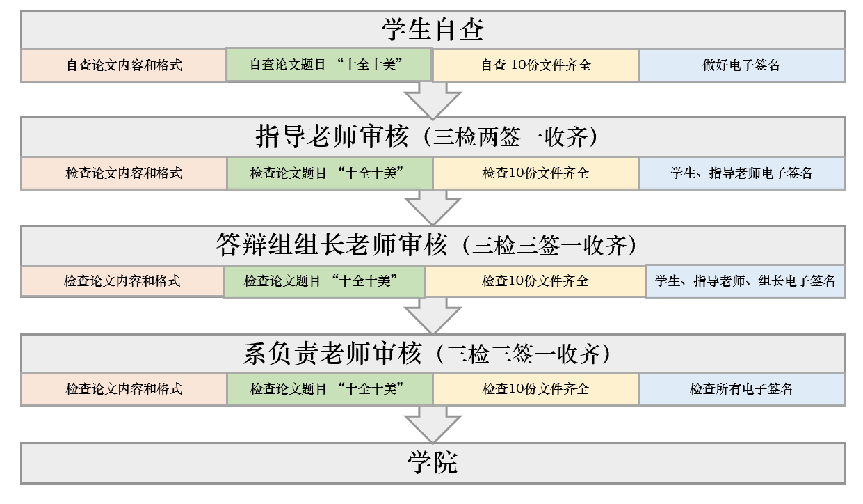 6. “三级审核”,“十全十美”工作流程图如下。其中提交的10份文件的论文题目均要与知网大学生毕业设计(论文)检测系统中的论文题目完全一致(简称“十全十美”)。