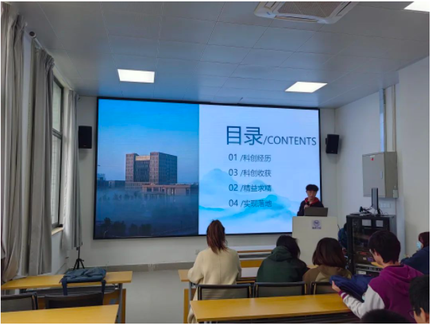 杨致津同学围绕着“科创经历”、“科创收获”、“精益求精”、“实现落地”这几个方面和大家进行了分享。他分享了参加科创比赛对自己的影响和改变,鼓励在座的同学们要敢于尝试,科创项目是机会是挑战,坚持不懈终将有所收获。