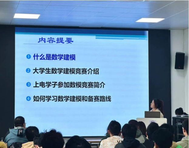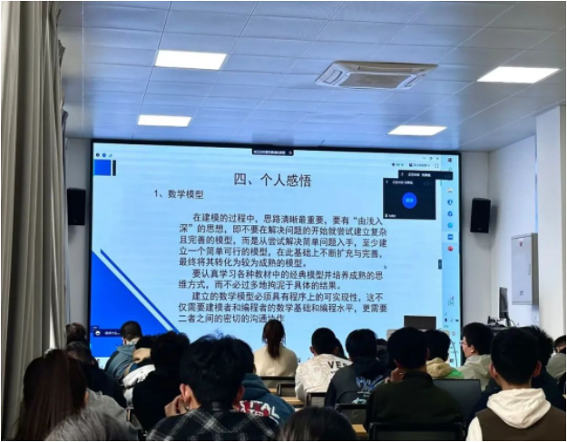 徐驰同学首先从“什么是数学建模”、“上电学子参加数模竞赛取得的成绩”、“如何学习数学建模和备赛路线”等方面为大家进行介绍。表示我们有专业的数学建模指导教师团队,我们的学姐学长们曾经取得过优异成绩,现在接力棒交到了我们手里,我们要传好接力棒,再上新台阶!